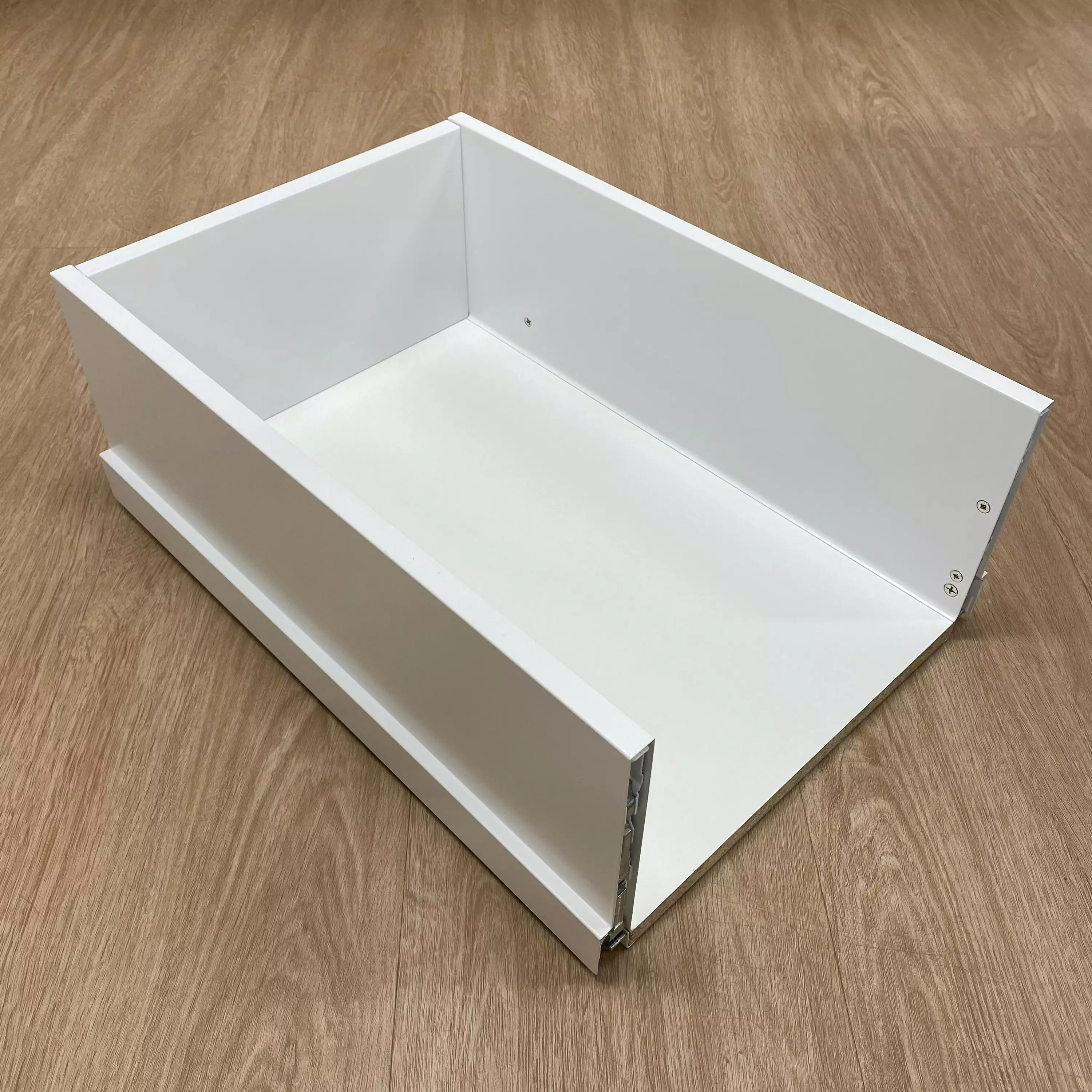 Laatikon malli Grass Scala. Sisältää runkoon kiinnitettävät hidastinkiskot, etusarjan kiinnikkeet, laatikon sivut, pohjan, takalaidan sekä reelinkikiskon.