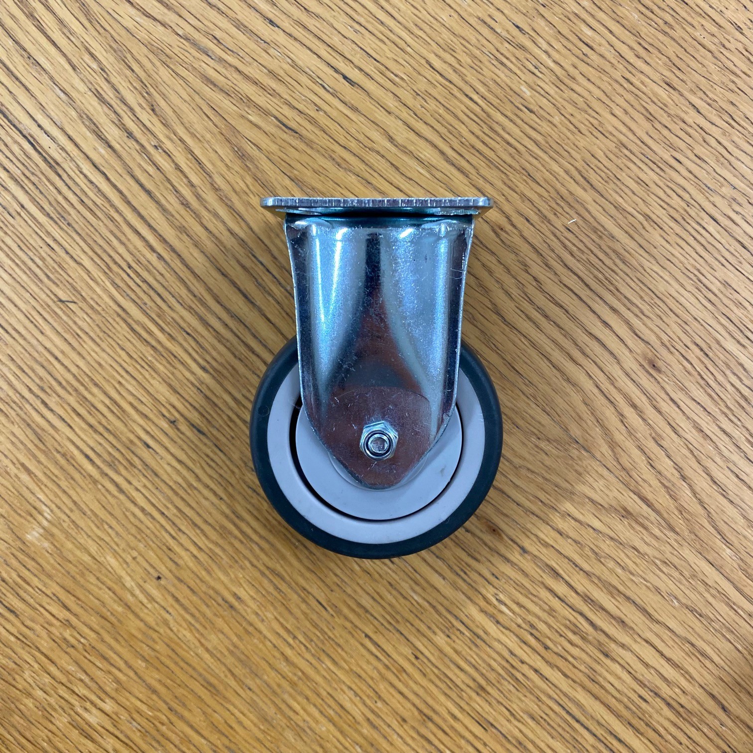 Kiinteä pyörä kumirenkaalla. Kokonaiskorkeus 100mm. Laipan koko 60x60mm. Kantavuus 70kg.
