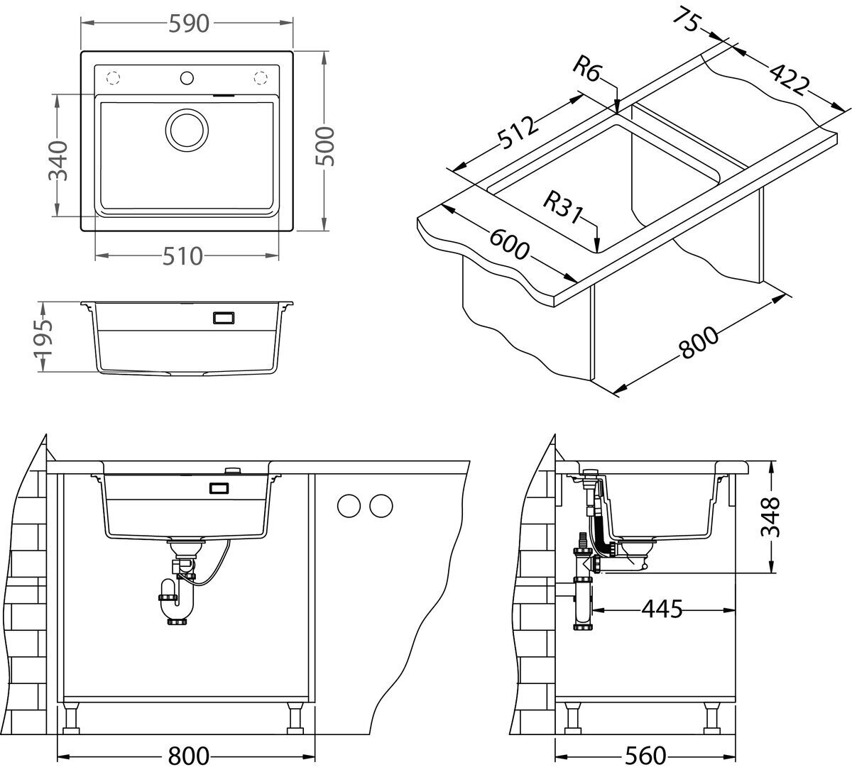Tyylikäs musta komposiittiallas laadukkaasta ja kestävästä Granital materiaalista. Sopii min. 600mm kaappiin.