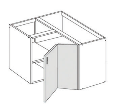 Kulmakaappi kahdella ovella. Kulmakaappi sisältää yhden hyllyn, mutta parhaiten tästä rungosta saa hyödyn irti esim. karusellimekanismilla. Rungon koko 708x885/985x568 (KxLxS). Ovikoko 2kpl 708x295/395 (KxL). Kalusteovi mittatilauksena.