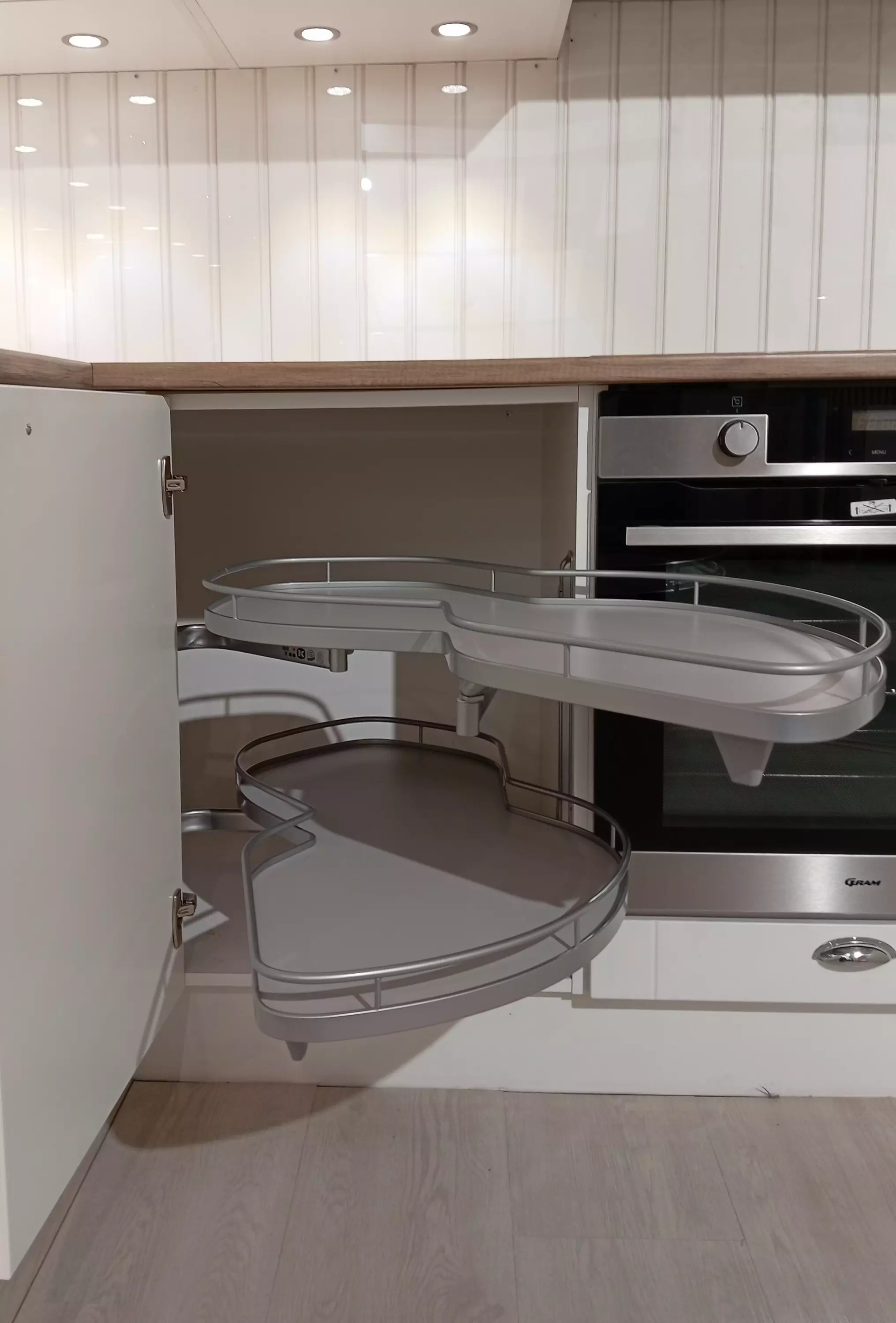 Kätevä piilokulmamekanismi, joka takaa täydellisen ja helpon pääsyn kulmakaapille, sillä hyllyt saa vedettyä kokonaan ulos kaapista.