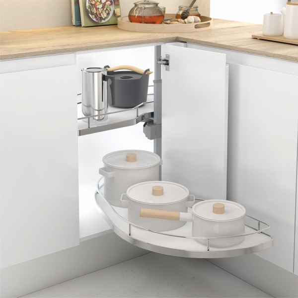 Laadukas ja käytännöllinen kulmakaappimekanismi, jossa on tukeva rakenne ja kaksi erikseen ulostulevaa levypohjaista hyllyä.