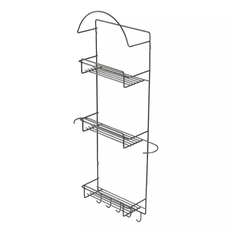 Antrasiitin värinen siivouskomeron seinäkiinnitteinen lankahylly, jossa kolme tasoa, letkupidike ja koukut.