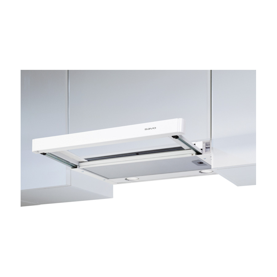 kalusteeseen integroitava moottoriteho 220-420 m3/h äänitaso 57-69 dB(A) ulosvedettävä lasilippa mekaaniset käyttökytkimet valaisinten nimellisteho 10W, 2 x 5W LED (GU10-kanta, 230VAC, 4000 K) metallinen pestävä rasvasuodatin SAVO Easyfix -asennus poistokanavan halkaisija 150/125 mm 498/598 x 280-330 (+20 mm etupaneeli) x 175 mm (l x s x k) maksimiavautuvuus 450 mm, minimiavautuvuus 300 mm