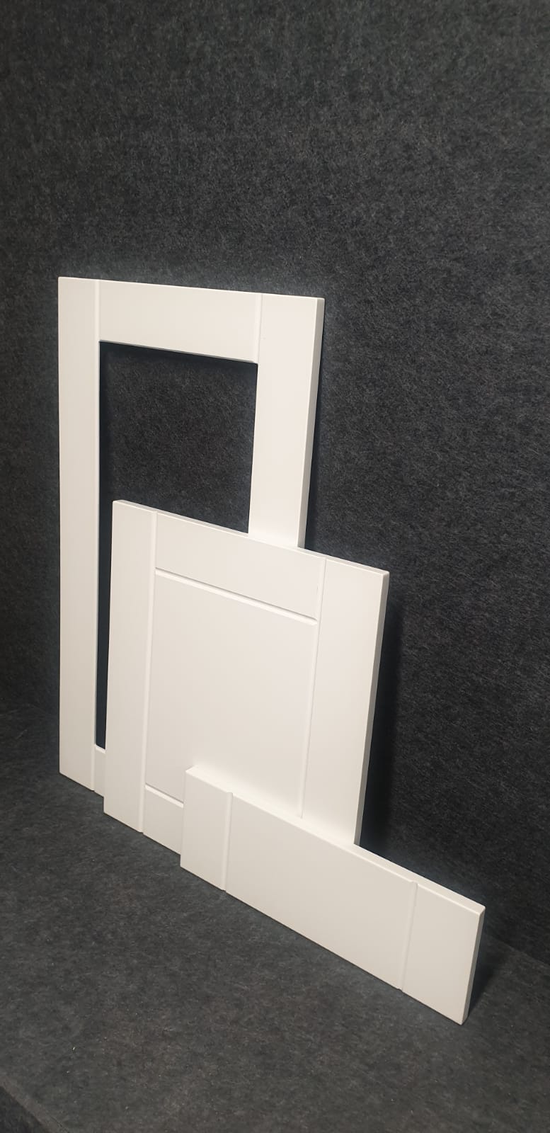 Maalattu valkoinen MDF-ov (16 mm)i. Osassa ovista saranaporaukset valmiina 80mm oven päistä.