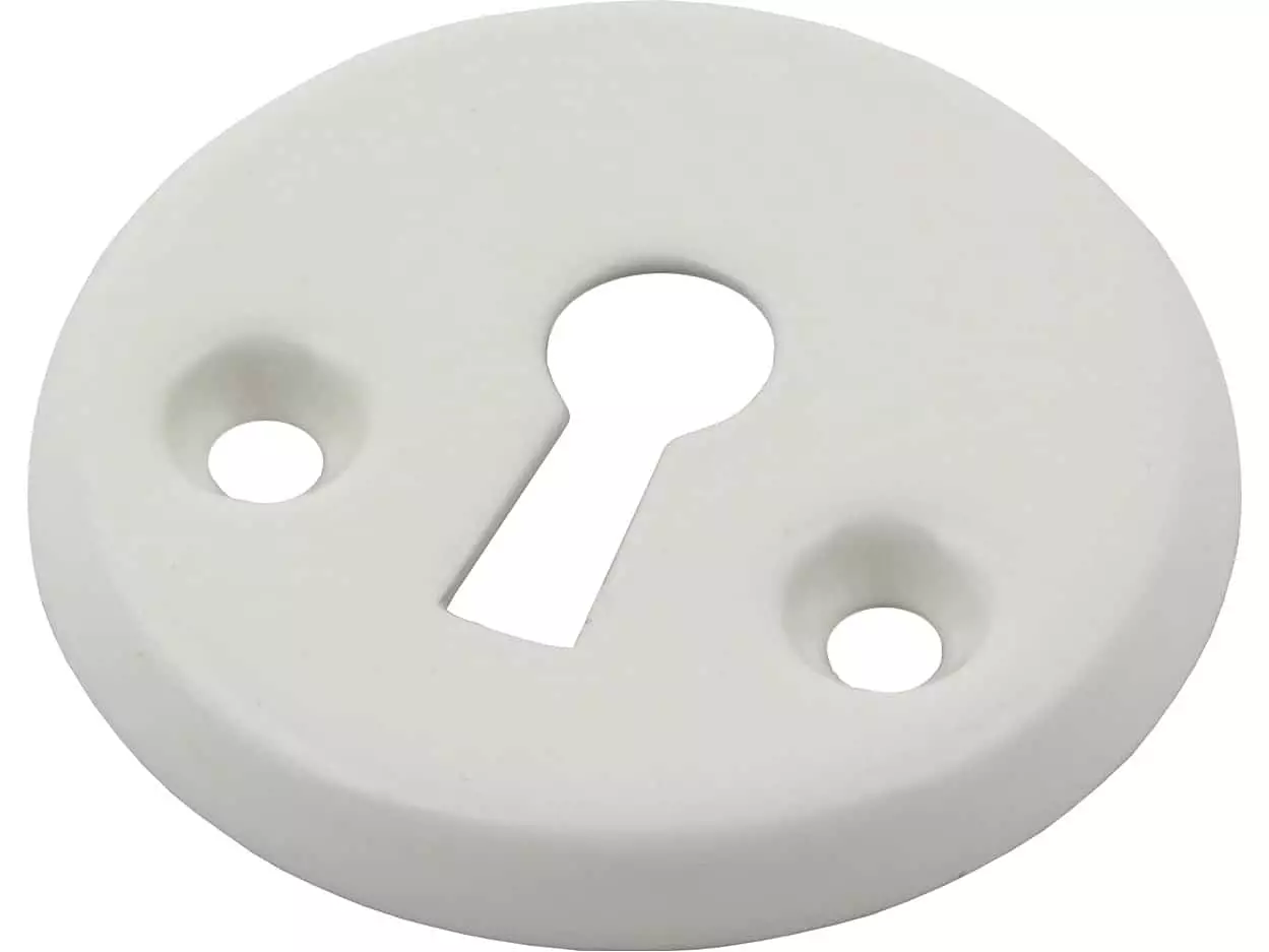 Avainkilpi välioville, materiaali teräs, viimeistely maalattu valkoinen. Pakkaus sisältää kilpiparin ja ruuvit. Kilven halkaisija 50 mm. Syvyys 5 mm.