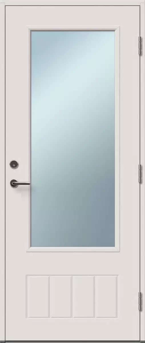 Valkoinen parvekemallinen ulko-ovi. Ovessa kirkas lasitus.