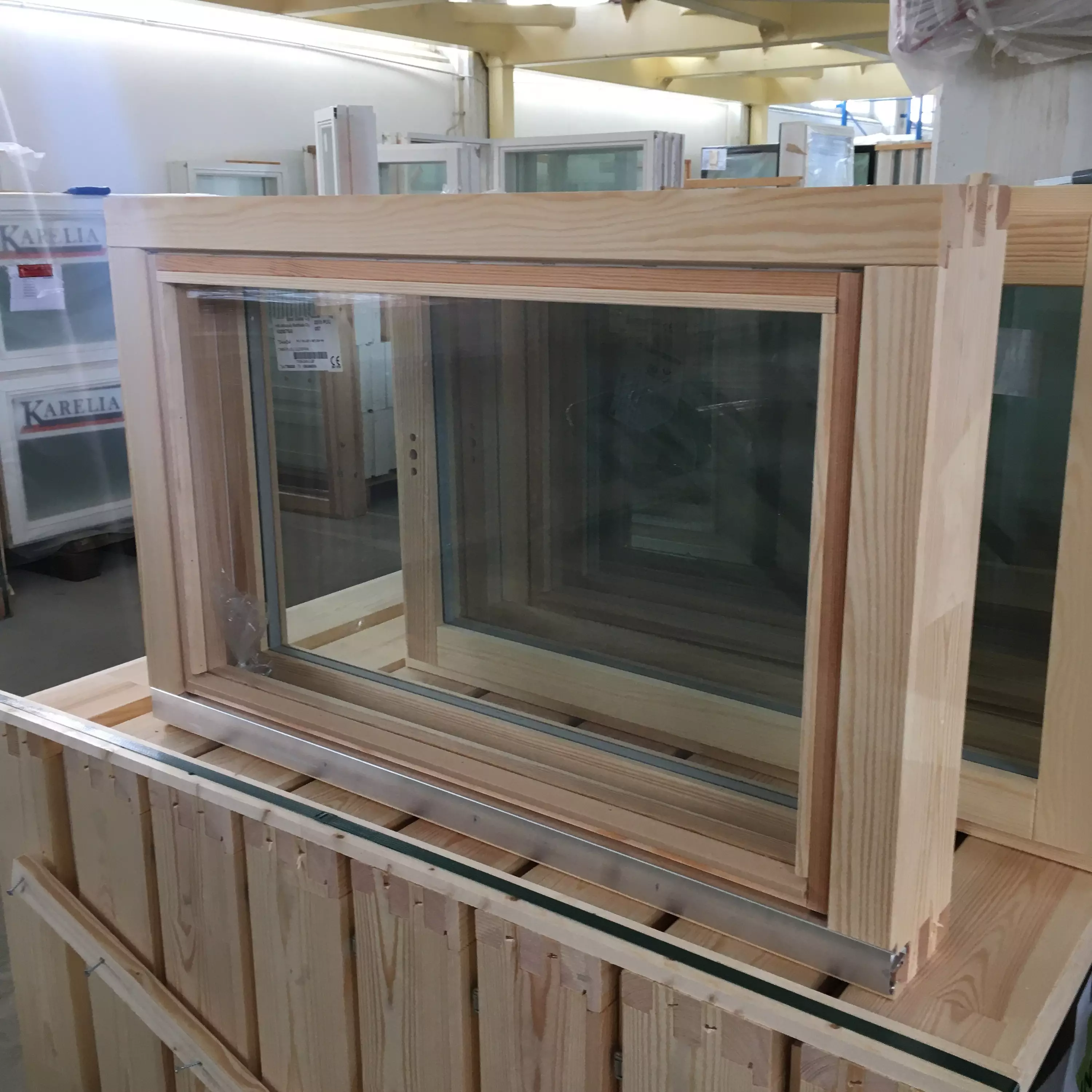 Puuvalmis avattava 3-lasinen puuikkuna. Sisäpuitteessa kaksinkertainen lämpölasi selektiivilasilla, välitilassa Argon. Ulkopuitteessa 3mm lasi.