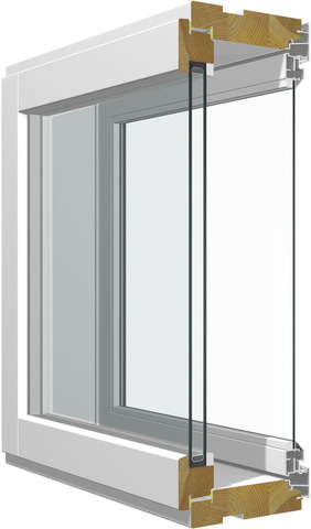 Valkoinen avattava kolmilasinen puualumiini-ikkuna. Sisäpuitteessa kaksinkertainen lämpölasi selektiivilasilla, välitilassa Argon. Ulkopuitteessa 4mm lasi. U-arvo 1,0.