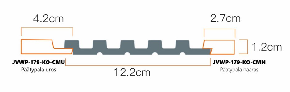 Leveys: 27mm Pituus: 2600mm Paksuus: 12mm Väri: Ruskea Materiaali: Polystyreeni Materiaalin tarkenne: Puukuosi Puulaji: Koivu Pintakäsittely: Maalattu Soveltuu kosteisiin tiloihin: Kyllä Soveltuu saunaan: Ei Päätypontti: Ei Johtoura: Ei Piilonaulaus: Kyllä Sisä-/ulkokäyttöön: Sisäkäyttöön Kuosi: Puujäljitelmä Asennustapa: Naulaus ja/tai liimaus