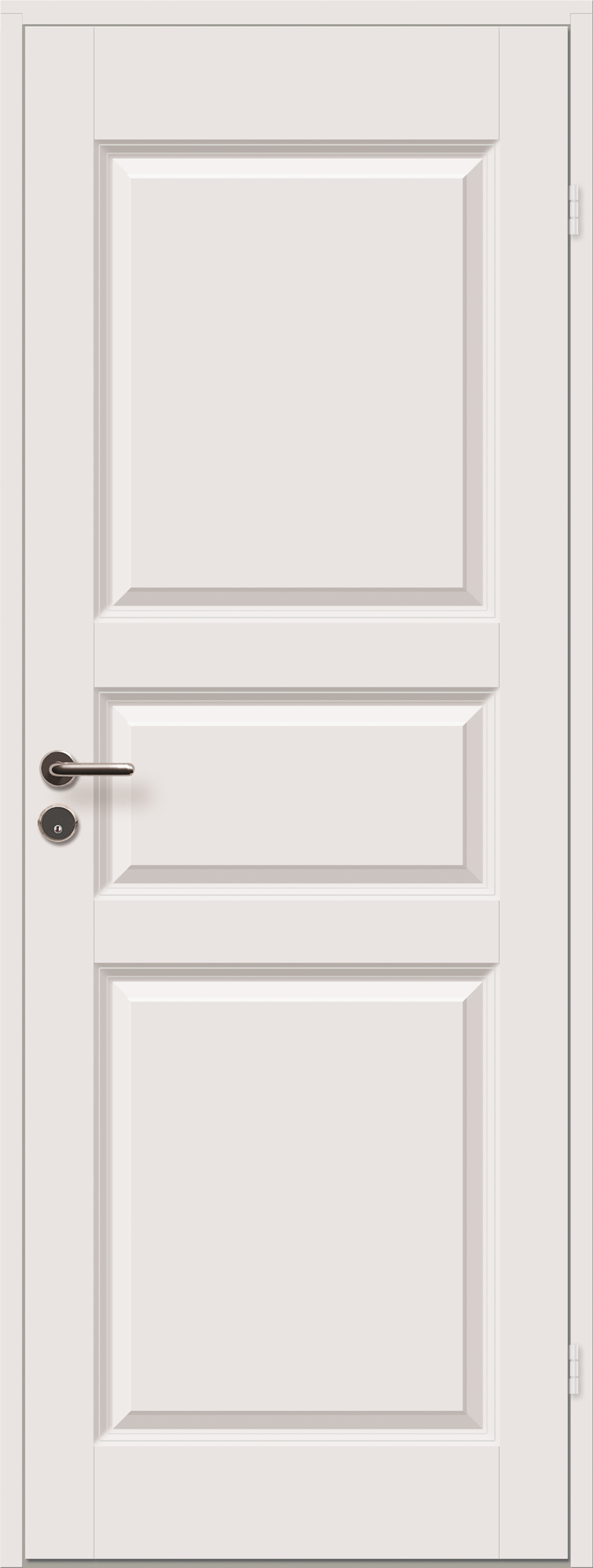 Valkoinen 3-peilinen väliovi kosteaan tilaan. Ovi on käsitelty kestämään kosteissa tiloissa, muttei kuitenkaan täysin vedenkestävä.