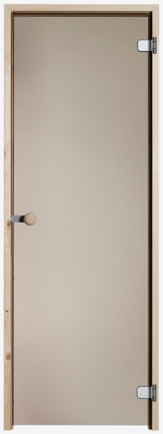 Kokolasinen saunanovi nuppivetimellä. Karkaistu 8mm lasi. Karmit ja nuppivedin mäntyä. Kätisyys vaihdettavissa vasen/oikea