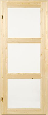 Lasitettu puuvalmis kolmiosainen saunanovi. Sisältää karmit. Kirkas lasi.