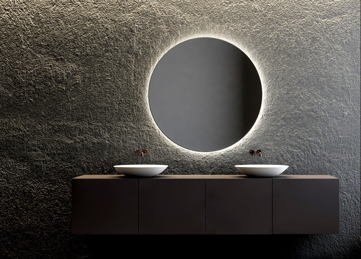 Tyylikäs pyöreä Riflesso on sileä peili, jossa on valaistus seinälle.